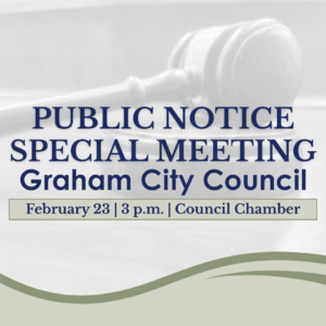 Public Notice is hereby given that the City of Graham City Council will hold a Special Meeting on Monday, February 23, 2026, 3:00 p.m. in the Council Chamber at City