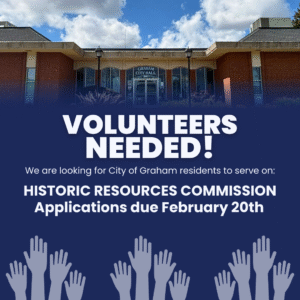 Want to make a difference in Graham? We’re looking for a resident to serve on one of our important boards: · Historic Resources Commission – Help preserve Graham’s heritage and historic character