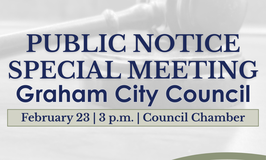 Public Notice is hereby given that the City of Graham City Council will hold a Special Meeting on Monday, February 23, 2026, 3:00 p.m. in the Council Chamber at City Hall, 201 S. Main Street, Graham, NC, to 1) Consult with Graham’s financial advisors, Davenport Associates, and 2) Review and provide feedback to the draft Rules of Procedure for City Council.